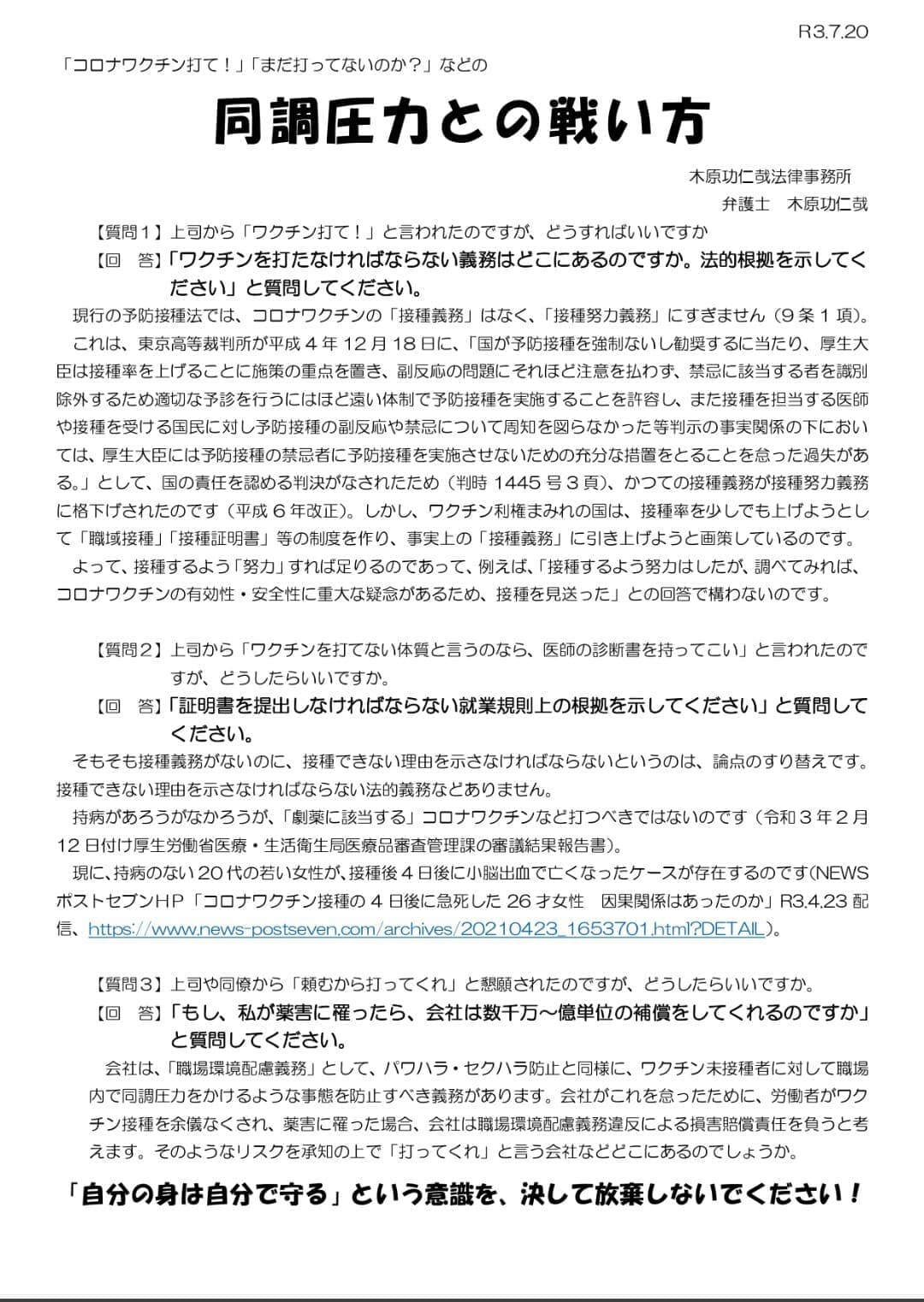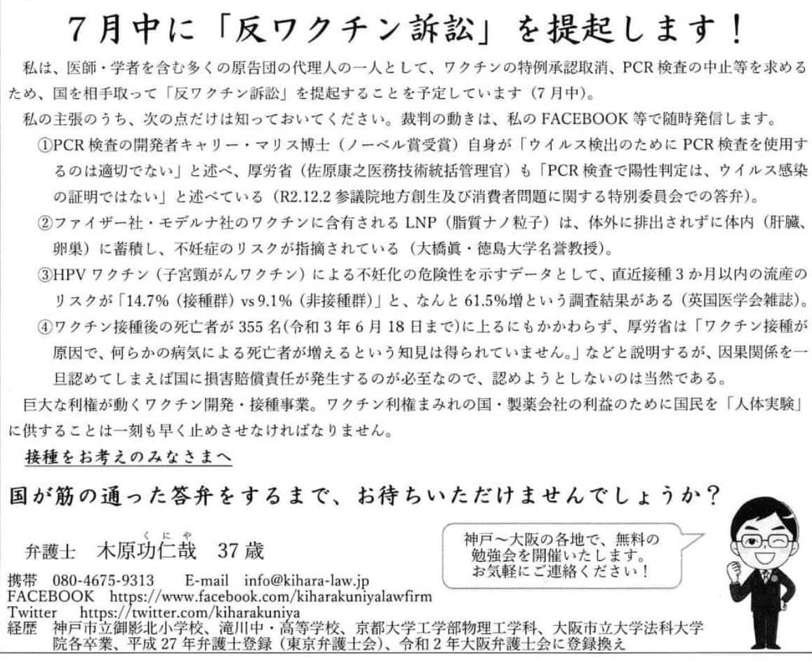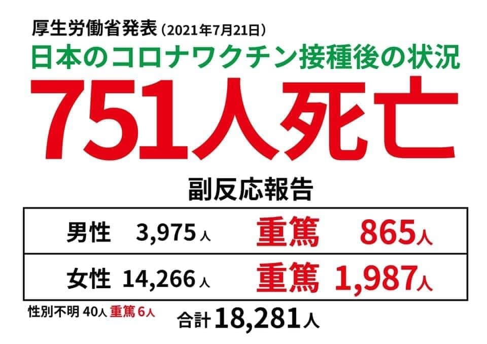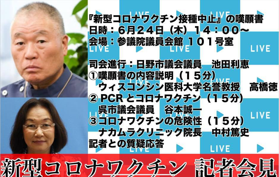 『新型コロナワクチン接種中止』の嘆願書を来週、厚労省に提出し、その後記者会見をされるとのこと。日時は6月24日(木)午後2時 参議院議員会館101号室 代表世話人:高橋徳先生