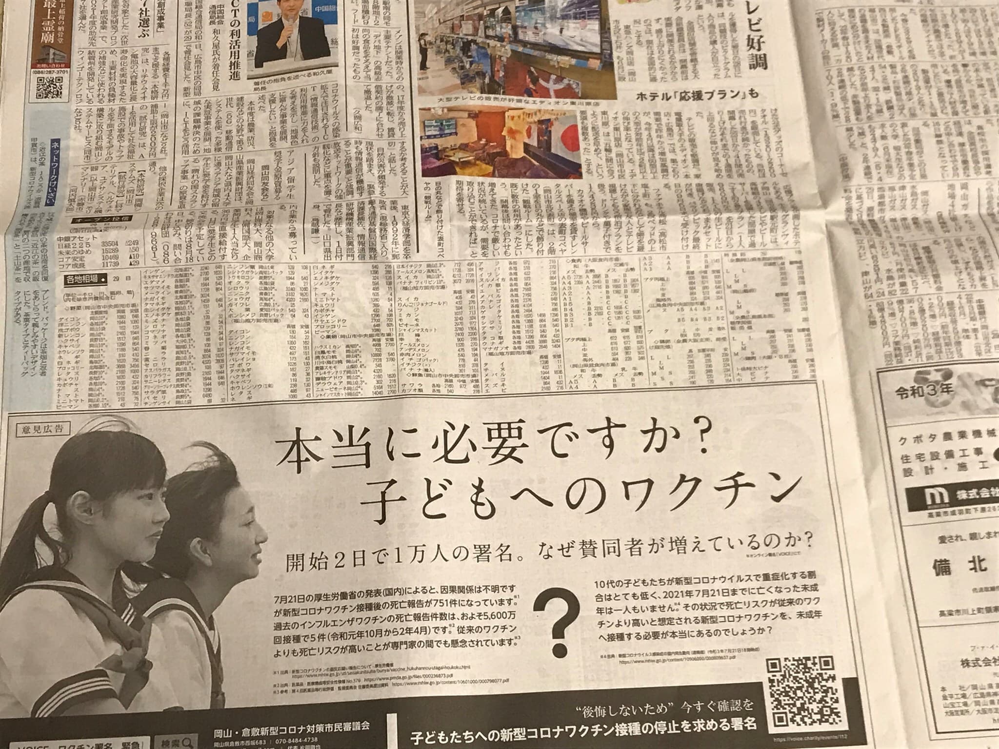 「今回の意見広告掲載は、この署名にご賛同いただいた北海道の有志の方がアクションを起こしていただき実現しました。先週の半ばから、新聞社とやり取りをしてくれて、わずか2日で掲載許可。ご寄付もいただき紙面に掲載です。しかも、偶然新聞社につながりのある方がいらっしゃったとのことで、奇跡のようなことが起こってたそうです。すごい!