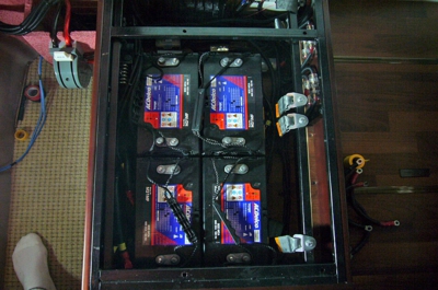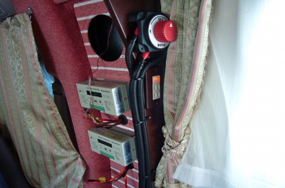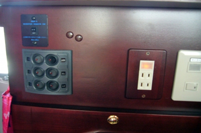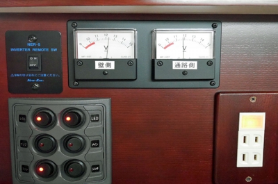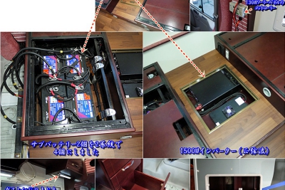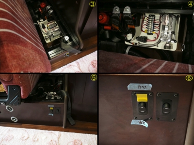 エアサスのコントロールユニット/ダイネット ③④ エアサスのコントロールユニットの部分です。 サードシート下に設置してもらいました。銀色の筒のような物がコンプレッサーです。 片側3個合計6個の風船をコントロールするために、強力タイプにしたそうです。 他社では車外に設置するとこともありますが、製品への負担を考えると 車内をお薦めしますとのことでした。 ⑤⑥ エアサス用のスイッチです。 右側のスイッチは単にON/OFF用のスイッチで必ず設置されますが 左側のスイッチはサブバッテリーの切り替え用のスイッチです。 写真は作業中でしたので、汚い状態ですが。我が家のボーダーには 200Ahのサブバッテリーを2個積んでいます。 エアサスの電源をバッテリーの状況に応じてどちらからでも自由に切り替えて 取れるように特注した物です。 |