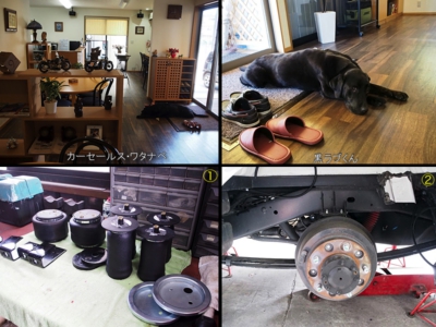 エアリフト社製エアサス・エアバッグ/足回り 最初の写真はカーセールスワタナベさんのお店です。 スッキリとしていて、シンプルながら居心地のいいお店でした。 そしてお隣りの写真は、2頭の黒ラブくんを飼われているんですが 弟くんですよ。とってもかわゆかったですぅ〜(*^_^*) 私は奥様と意気投合してしまい、何度か訪問させてもらいましたが、その度に わんこ談義、お花談義、音楽談義とおしゃべりに花を咲かせてしまいましたよ。 ① 我が家のボーダーに取り付け予定の風船(エアバッグ)です。 カムロード用のキットの場合は片側1個だと言うことですが、 重量級のボーダーは片側3個取り付けます。 2個+エアタンクでも何とかなるとのことでしたが、キャパに余裕を 持たせ3個仕様でお願いすることにしました。 ② 後輪を外して、装着前の状態です。 3週間後、ボーダーを引き取りに行った時はすでに後輪が装着されていましたので 後輪に隠れて残念ながら取り付け後の写真は撮れませんでした。 |