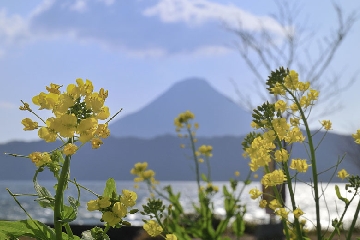 開聞岳をバックにススキやなんと菜の花のコラボの撮影が