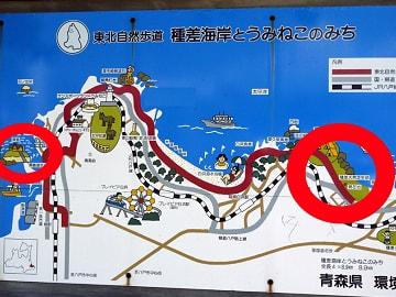 (向かって左の赤丸が蕪島神社で右が種差海岸)