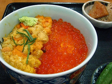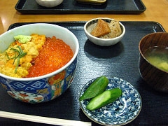 私達は手作り料理の「田舎」というお見せで生ウニ&いくらの二色丼を頂きました〜