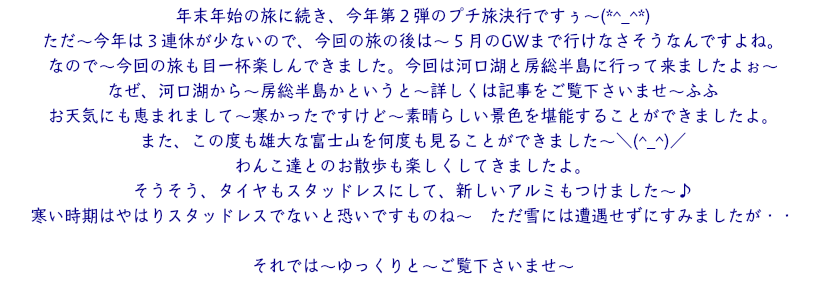 1日目は河口湖のオルゴールの森に行き、館内を見学。。ランチもセットにしたので〜ここで済ませる。そこで嬉しいことがありました〜ふふ その後は道の駅「かつやま」にある小海公園でわんこ達とお散歩。そして大石公園で素晴らしい富士山を撮影。道の駅「なるさわ」で、富士眺望の湯「ゆらり」の貸し切り風呂に入り、夕食。。