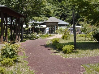 奥の建物はふるさと振興館